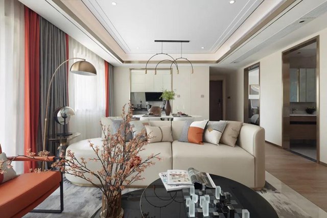 客廳米色的皮質沙發(fā),和側面的橙色椅,金屬元素的落地燈,擺上雅致精致的小物件,呈現(xiàn)出自然舒適的溫馨感。