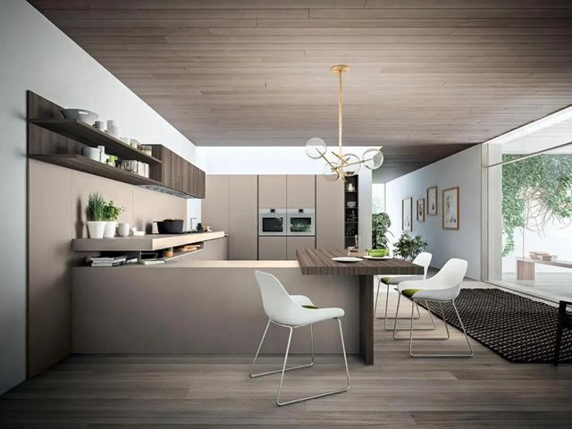 由中心島臺延伸出的餐桌,以高度來劃分出烹飪區(qū)和用餐區(qū),在這里享用早餐最能節(jié)省時間,同時如果偷懶坐下來備餐也更加舒服。造型簡潔、深淺錯落的餐桌燈形成流動的曲線搭配在這個淺色調的廚房,打造出親切清新的小餐吧。