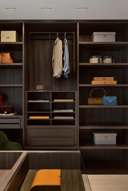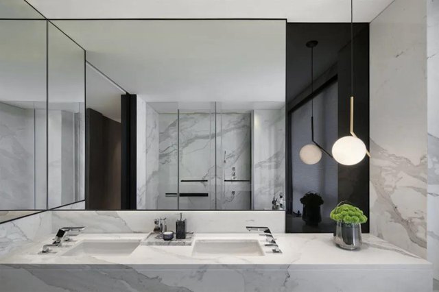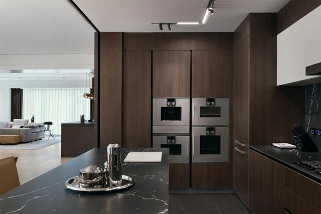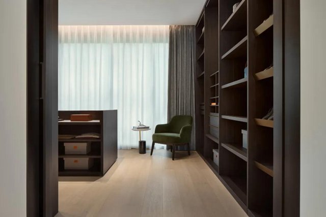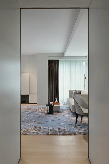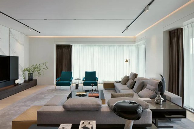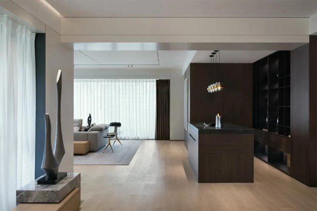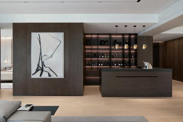 為合理利用空間,布局上增加了水吧區(qū)、閱讀區(qū),滿足居住者的不同需求。設計處處關照居住的細節(jié),智能燈光系統(tǒng)根據(jù)居住場景呈現(xiàn)會客、休閑、起夜等模式,燈光隨心而動,電動窗簾靜音又省力。