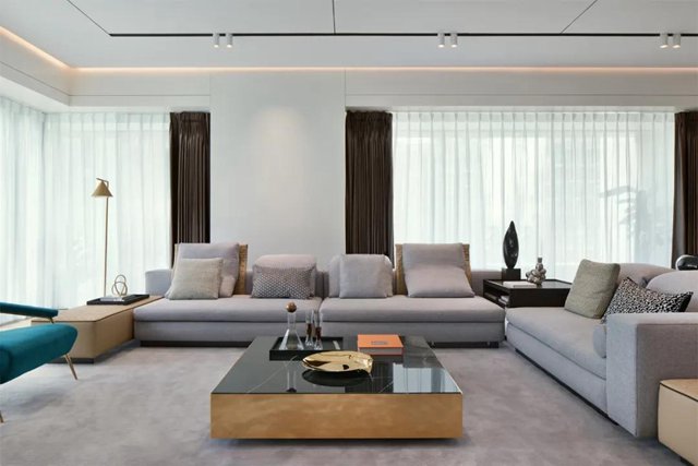 高雅的生活環(huán)境,精致的生活品質(zhì),令身處國際都市的現(xiàn)代人所追求。客廳保證大面積采光面,開敞通透。地毯由真絲羊毛混織而成,順滑蓬松,形成美麗的光澤感。金色茶幾、皮質(zhì)茶幾、玻璃器皿、金屬托盤之間形成豐富材質(zhì)的碰撞,烘托出豪宅的品質(zhì)感。