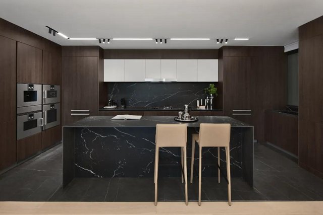 闊綽的中西雙廚區(qū),選用德國高端進口Hacker櫥柜,筒燈為廚房營造藝術(shù)品般的照明氛圍。