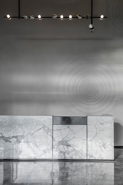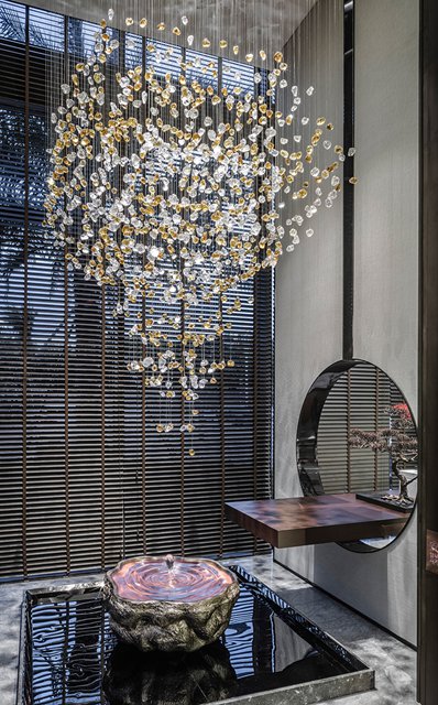 茶藝區(qū)以胡桃木材及大理石磚為主調(diào),水滴狀的玻璃掛飾以靈動(dòng)之勢(shì)緩緩落下,展現(xiàn)“力”與“美”的交互碰撞,使空間剛?cè)岵?jì),體驗(yàn)高貴典雅的恢弘氣勢(shì)。