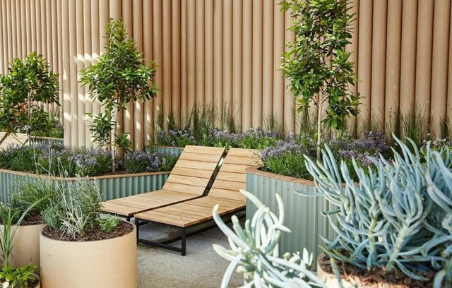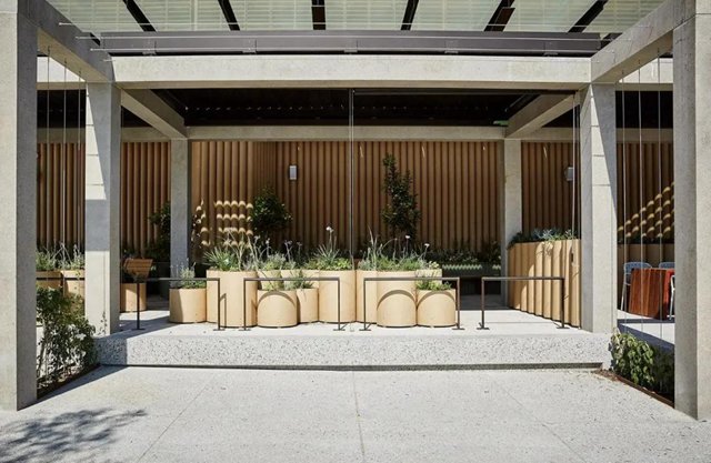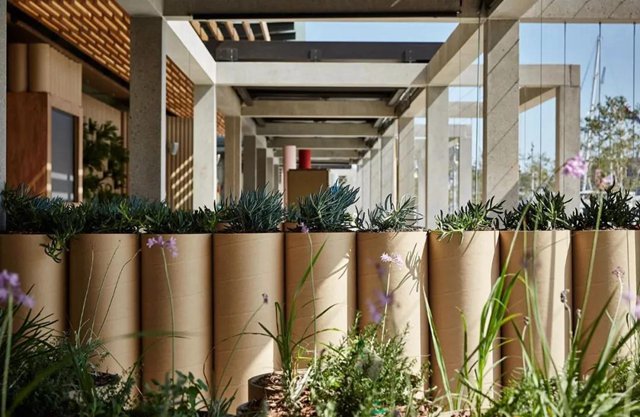 巧妙又簡(jiǎn)潔的綠墻和系列植物組合造景,設(shè)置于大尺度的紙管中。設(shè)計(jì)靈感來(lái)源于海岸邊界線,由座椅、公共看臺(tái)和豐富的植物種植組合構(gòu)成了一片起伏的景觀。