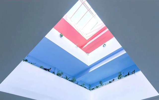 這個(gè)空間充滿了綠色。二樓畫廊和禮堂通過(guò)天頂自然采光,綠色植物使空間成為一個(gè)整體。園內(nèi)采用色彩飽和度高的花盆,與室內(nèi)軟裝形式融合,充滿了童趣。