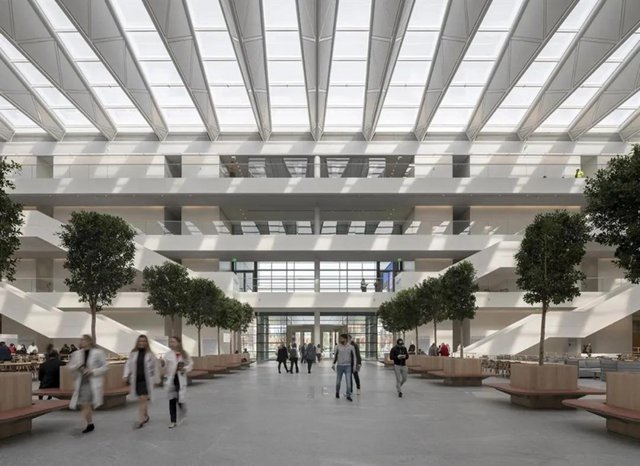 垂葉榕樹(shù)在健康中心的東西入口之間限定出一個(gè)走廊,不僅強(qiáng)調(diào)了中庭的大尺度,更為空間平添了幾抹平靜的綠意。