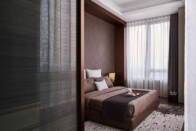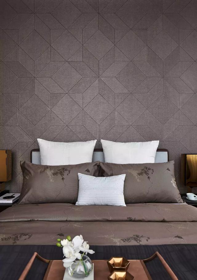 長輩房套間色調(diào)沉穩(wěn)內(nèi)斂,與主臥套間一脈相承的拼花背景墻被納入其中,規(guī)整中又極具韻律變化。莊重華貴的深咖色床品靜淌,調(diào)適出一種雅致心境。