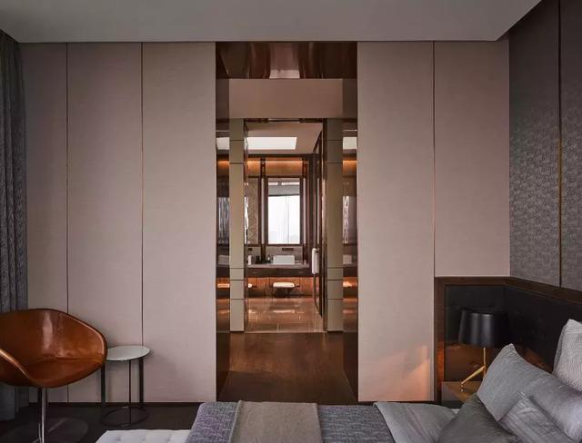 主臥套間內(nèi),十字動線交叉串聯(lián),強調(diào)功能、結(jié)構(gòu)、用材、形式的完整與延續(xù),實現(xiàn)無拘率性、干練利落的質(zhì)感表達。