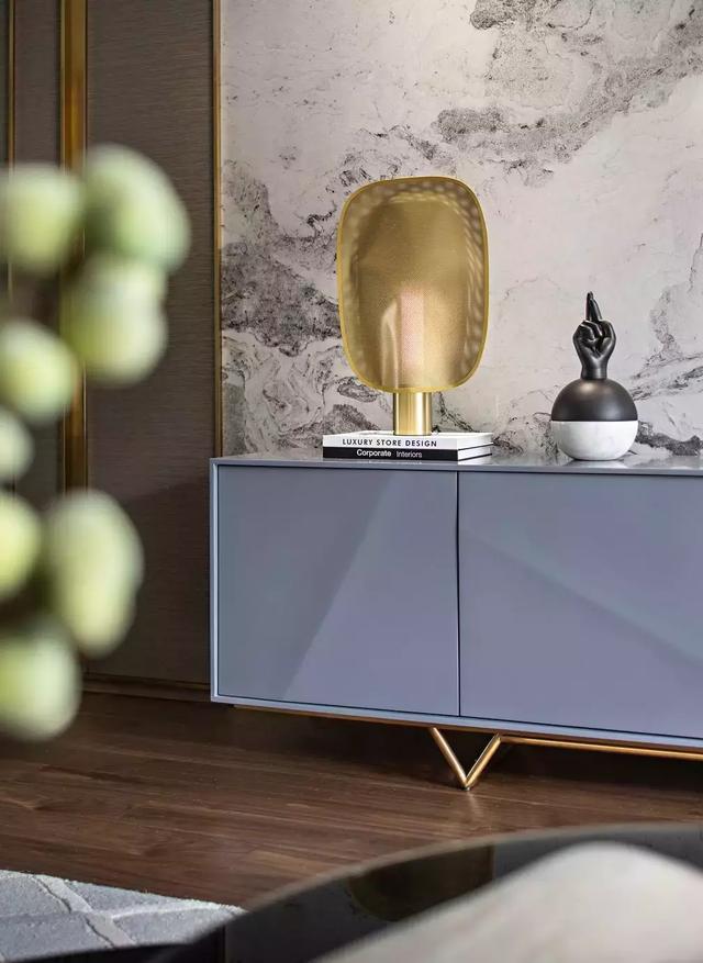 客廳的電視背景墻,香檳金木飾面與灰紋大理石形成搭配,以柔和分明的線條勾勒生活質(zhì)感,豐富多樣的飾品擺件詮釋著最輕奢的都市生活格調(diào)和訴求。