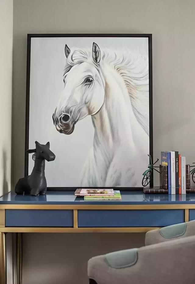 在兒童房的軟裝陳設(shè)上,設(shè)計(jì)仍然以藍(lán)色為主調(diào),同時(shí)融入動(dòng)感的馬術(shù)元素,為空間增添活力。