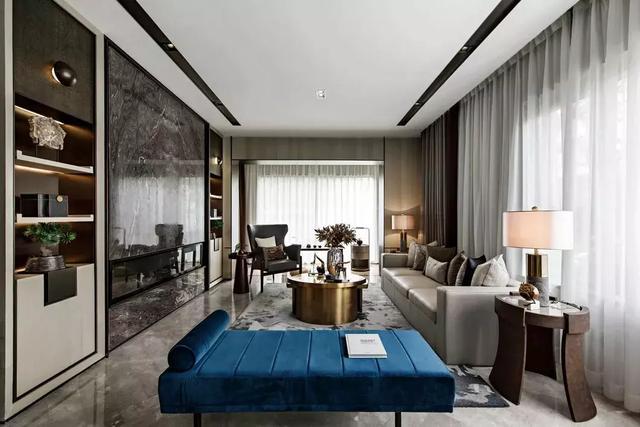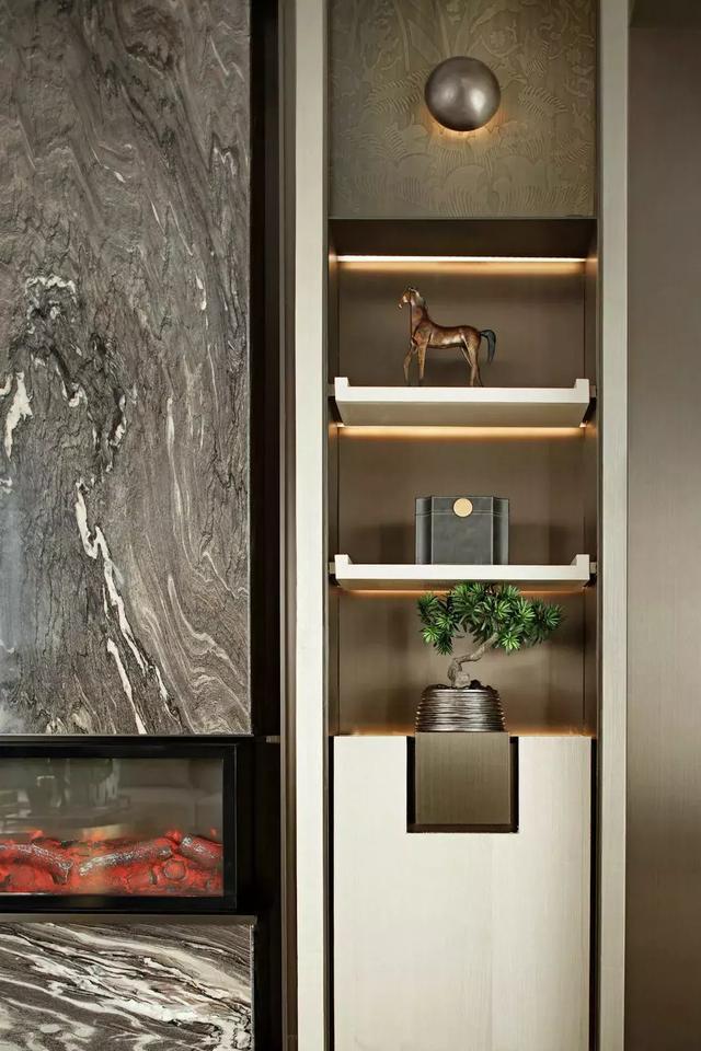 在雅致東方風(fēng)格的設(shè)計(jì)中,設(shè)計(jì)師從當(dāng)代生活觀念出發(fā),并不囿于傳統(tǒng),施古不泥古。大理石主墻面嵌入壁爐、包豪斯風(fēng)格的條凳、黃銅茶幾,混入客廳空間自成一格。