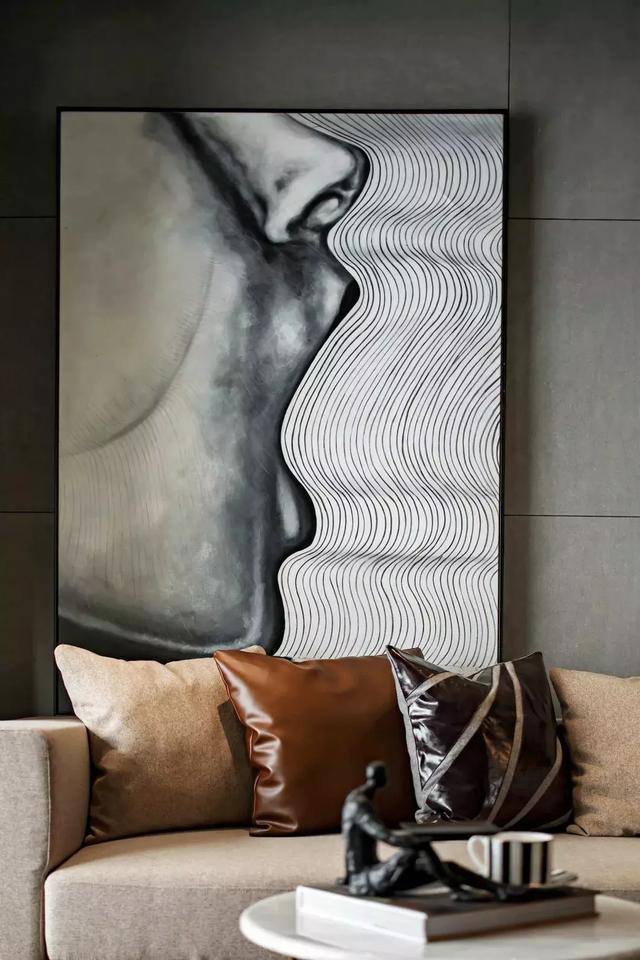 飽和度較高的色彩出現(xiàn)在軟裝飾品上,橙黃的皮革座椅、粉紅裝飾畫、金質(zhì)茶幾等設(shè)計(jì)要素,豐滿了視覺觀感,從灰色背景中跳躍出來,讓空間生機(jī)勃勃。