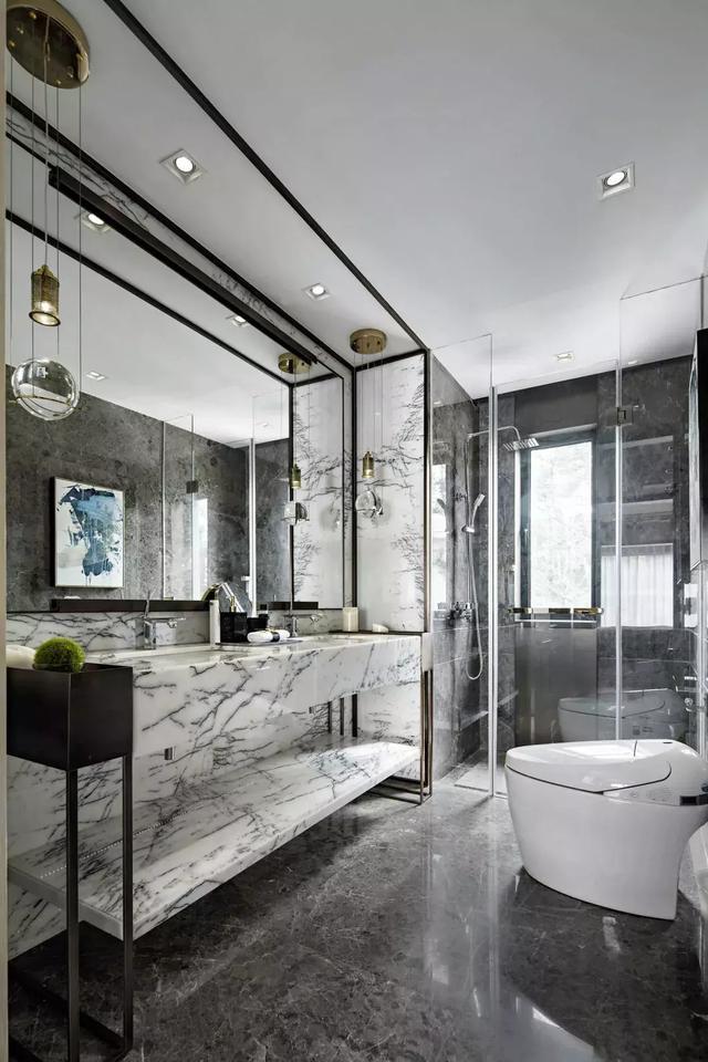 穿過衣帽間兼化妝室,衛(wèi)生間功能完備。大理石的奢華中保持素雅的整體風(fēng)格,雙洗手臺上垂下吊燈,親切可人。