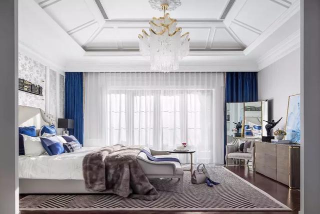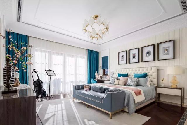女兒房精致石膏線與水晶吊燈的組合,充分展現(xiàn)空間的層次美感。亮色壁紙、地毯,搭配復(fù)古孔雀藍(lán)軟裝,考究的黑胡桃木沉淀了浮華,隨著光線強(qiáng)弱的變化,呈現(xiàn)出耐人尋味的空間韻律。