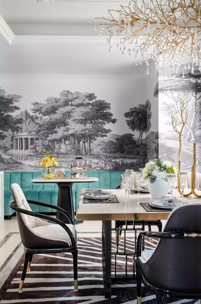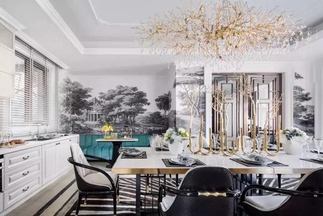 實(shí)用性之上兼具美觀,餐廳是家居生活的心臟。完全開(kāi)放式的客廳餐廳,使得空間通透舒展。色彩上延用客廳的搭配形式,法式園林壁紙圍繞空間展開(kāi)敘事,現(xiàn)代感強(qiáng)烈的餐桌餐椅,襯以貴氣的金屬鑲邊,是古與金的碰撞。