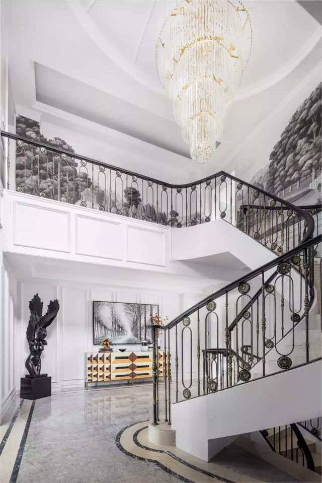 這種在美學(xué)上的深刻共鳴,成為打造本案的切入點(diǎn)。為營(yíng)造一個(gè)蘊(yùn)含文化氣息的雅致空間,設(shè)計(jì)師以尊貴穩(wěn)重的石材鋪陳地坪,樸素精致的壁紙裝飾墻面,鐵藝旋轉(zhuǎn)樓梯扶手穿插其中,在整個(gè)場(chǎng)域入口處,奠定空間基調(diào)。