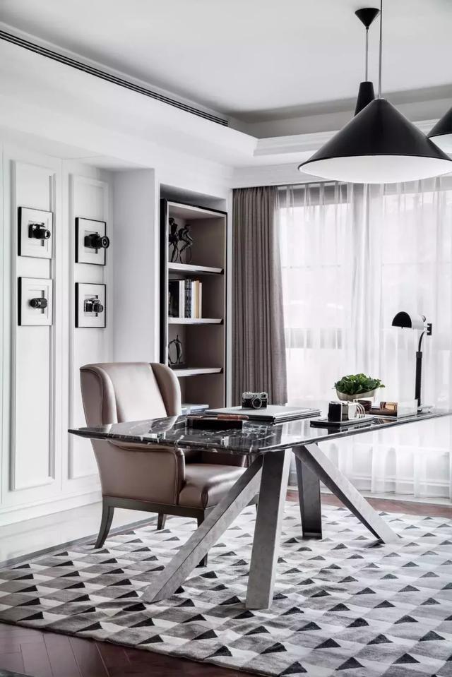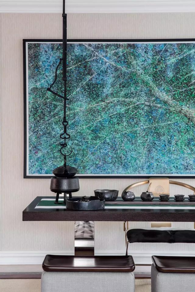 負(fù)一層被打造為男主人書(shū)房和地下茶室,是為實(shí)現(xiàn)最優(yōu)布局。黑、白、灰構(gòu)成的書(shū)房,為喧囂中安靜一隅,使人置身其中,恍若隔世。茶室靜謐幽清,悟禪解意,感受繁華都市內(nèi)難覓的安寧和歷久彌新的氣韻,不突兀、不違和,仿佛天生就該同俱一體。