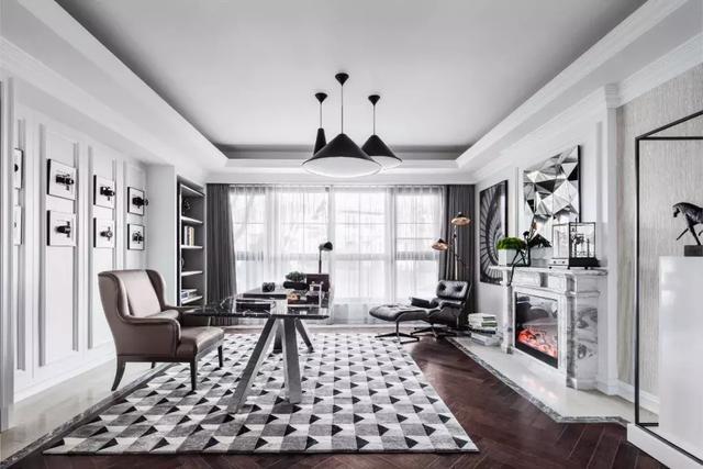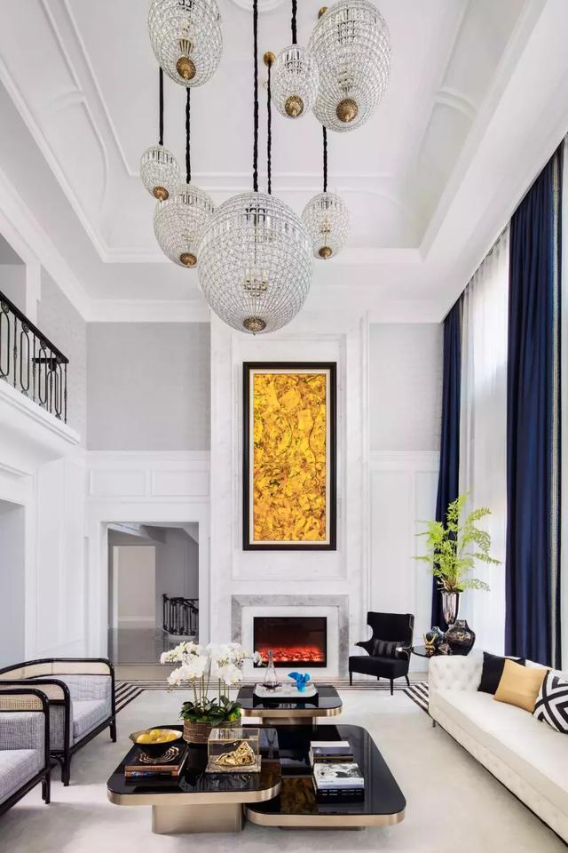 步入客廳,偌大的挑空空間,家具以圍合的形式相聚,意為圓滿、方正。整個(gè)空間以三面落地窗環(huán)抱,與室外景致無(wú)縫相接。高低錯(cuò)落的吊燈,增加挑空的靈動(dòng)性。黑白灰為基色,藍(lán)金相輔相成活躍其中。