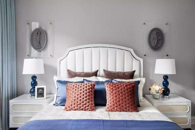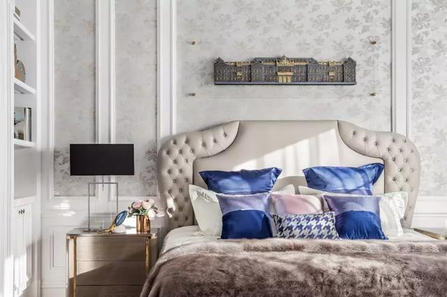 主臥以高級(jí)灰色占主調(diào),樸素典雅的壁紙使得空間通透明亮同時(shí)也更顯精致華貴。奶油色皮質(zhì)床頭配以藍(lán)色床品點(diǎn)綴,又為空間注入舒適溫馨的氛圍,讓心靈遠(yuǎn)離都市的喧嘩,進(jìn)入忘我的境界,讓生活每時(shí)每刻回歸經(jīng)典。
