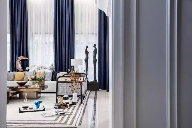 設(shè)計(jì)師運(yùn)用古典法式元素勾勒出空間線條,但摒棄了繁瑣和沉重,注入現(xiàn)代感材質(zhì)和顏色賦予其靈魂。客廳相面對(duì)的兩人雕塑,體現(xiàn)家的歸屬感,營(yíng)造出舒適、優(yōu)雅、具有文化氛圍的空間,讓居住者實(shí)現(xiàn)與其對(duì)話的期許。
