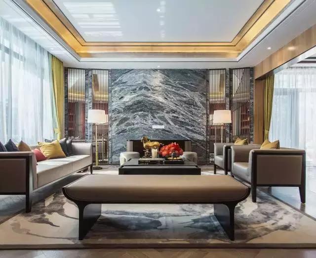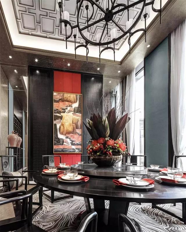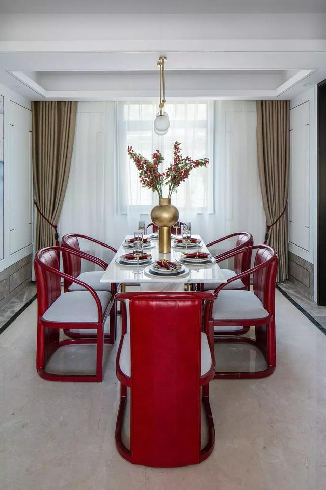 簡潔典雅的玫瑰椅,端正清秀的坐榻,氣質(zhì)雍容的茶幾邊桌,質(zhì)感上乘的柔軟地毯,賦予空間古雅、質(zhì)樸又不失現(xiàn)代的美感;其古樸的造型與正統(tǒng)的設(shè)色,成雙陳設(shè)的器物裝飾,流麗軒昂的水晶吊燈,共同造就空間的秩序感與對稱性,儼然大氣。