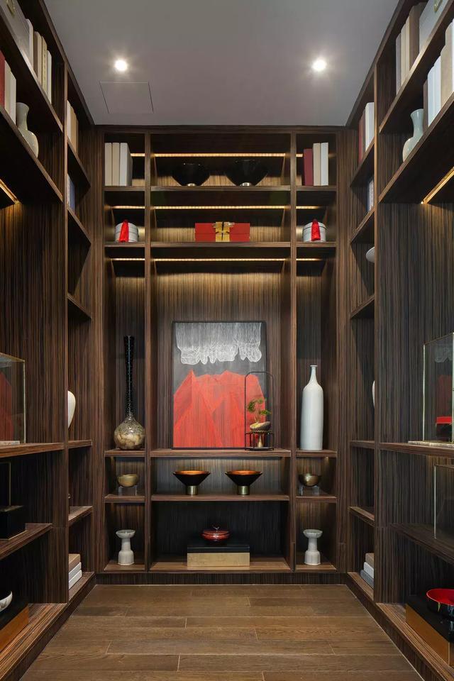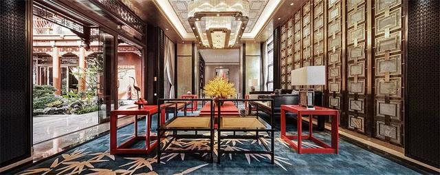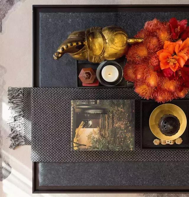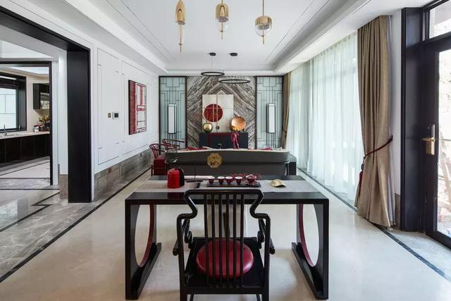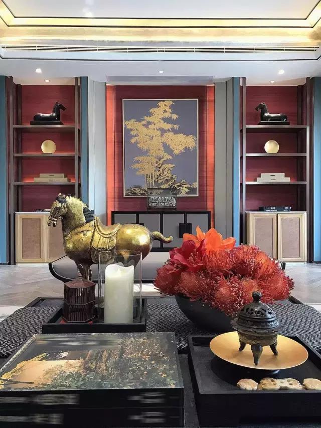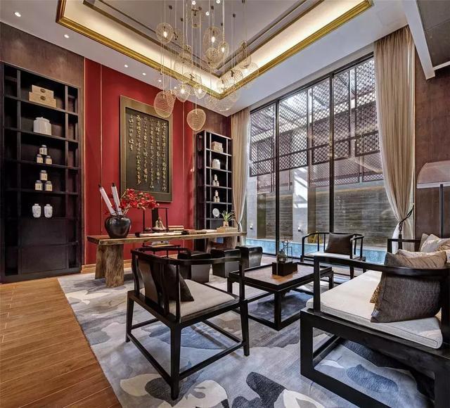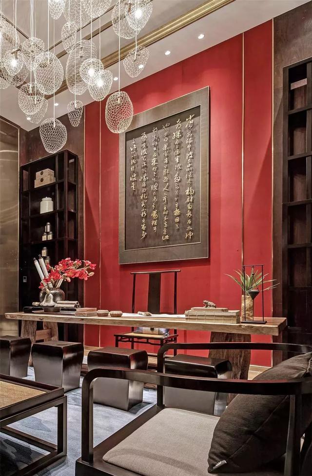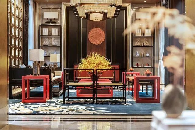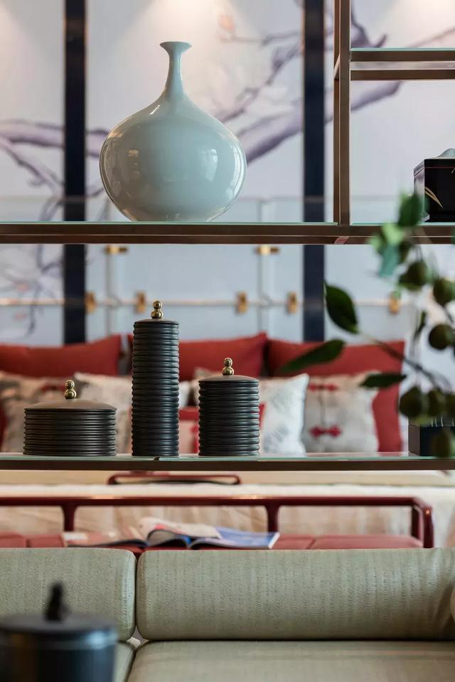 琉璃燈具上流動的光影如粼粼水紋,蕩漾在天花,又折落到柔軟的地毯上,四方周正的空間中流淌著靈趣。遵循著古代禮制的家具成序擺放,古沉的灰調(diào)與木色上搭配正統(tǒng)的紅色與黛藍,相得益彰,頗有大家風(fēng)范。