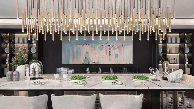 縱向拉伸、線條流動(dòng),因?yàn)榭蛷d本身就具備強(qiáng)烈的張力,所以天花一改繁復(fù)的古典裝飾,只通過(guò)簡(jiǎn)潔的線與溫潤(rùn)的弧勾勒。