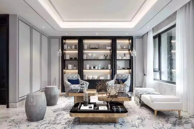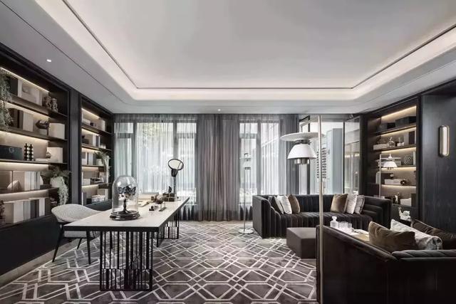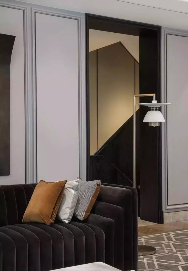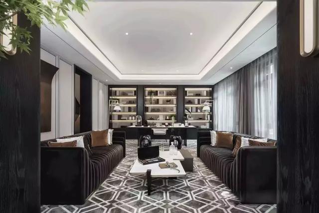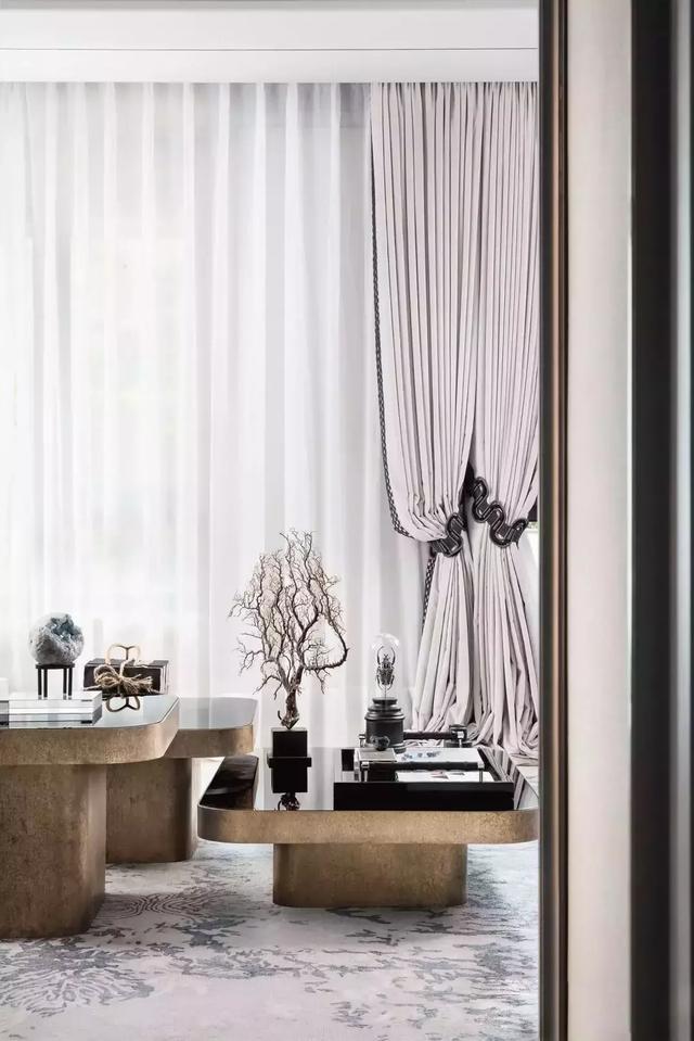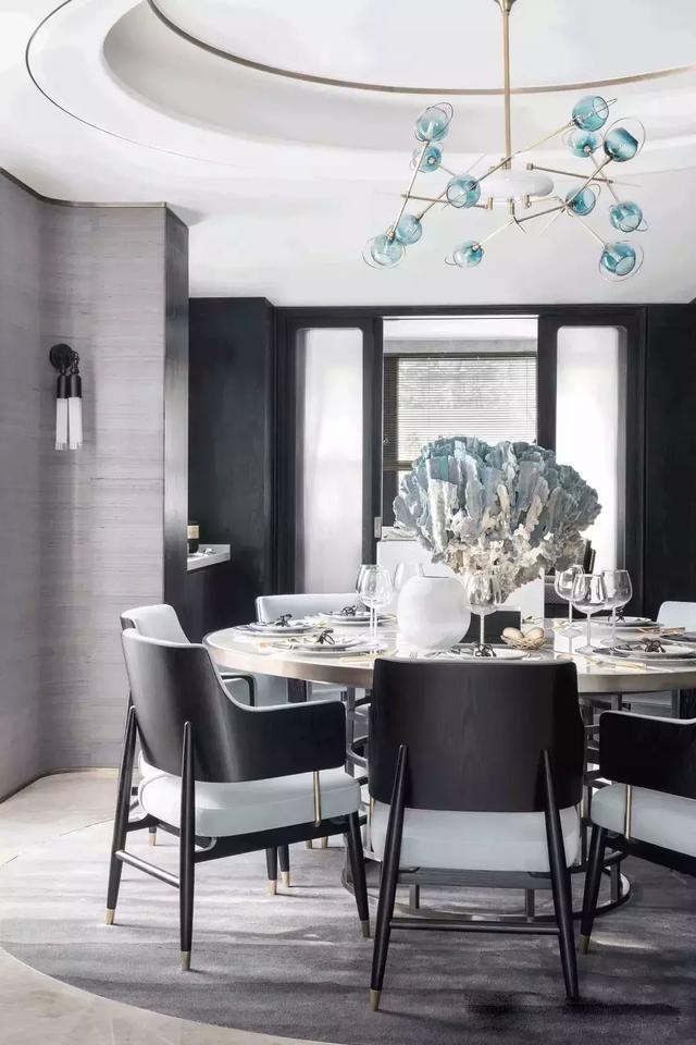 與書(shū)房區(qū)不同,線條的呈現(xiàn)方式,在女主人的下午茶空間變得溫柔了許多。從地毯的扇形拼接、線型吊燈的錯(cuò)落秩序,到座椅的優(yōu)雅姿態(tài),將當(dāng)代東方女性的韻味淋漓展現(xiàn)。
