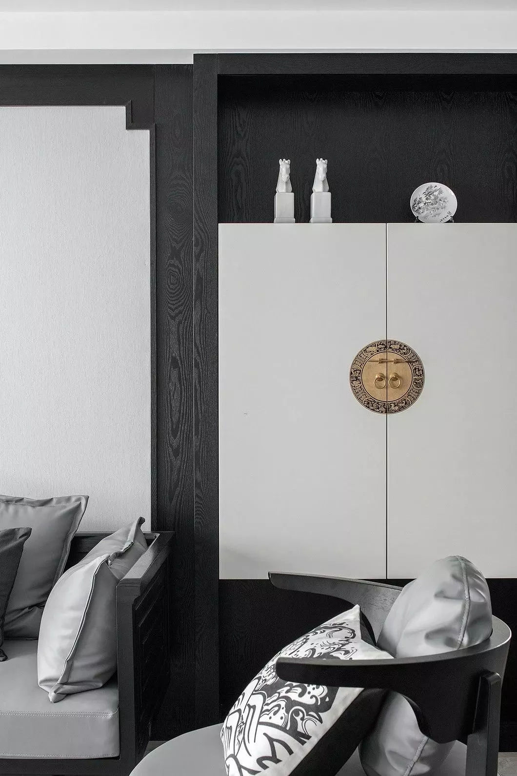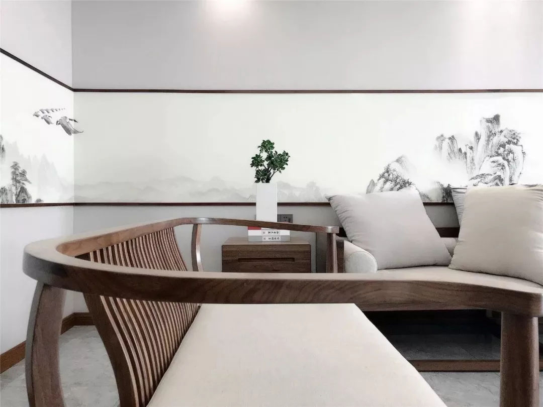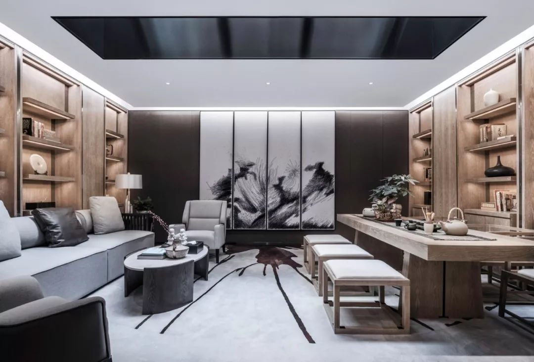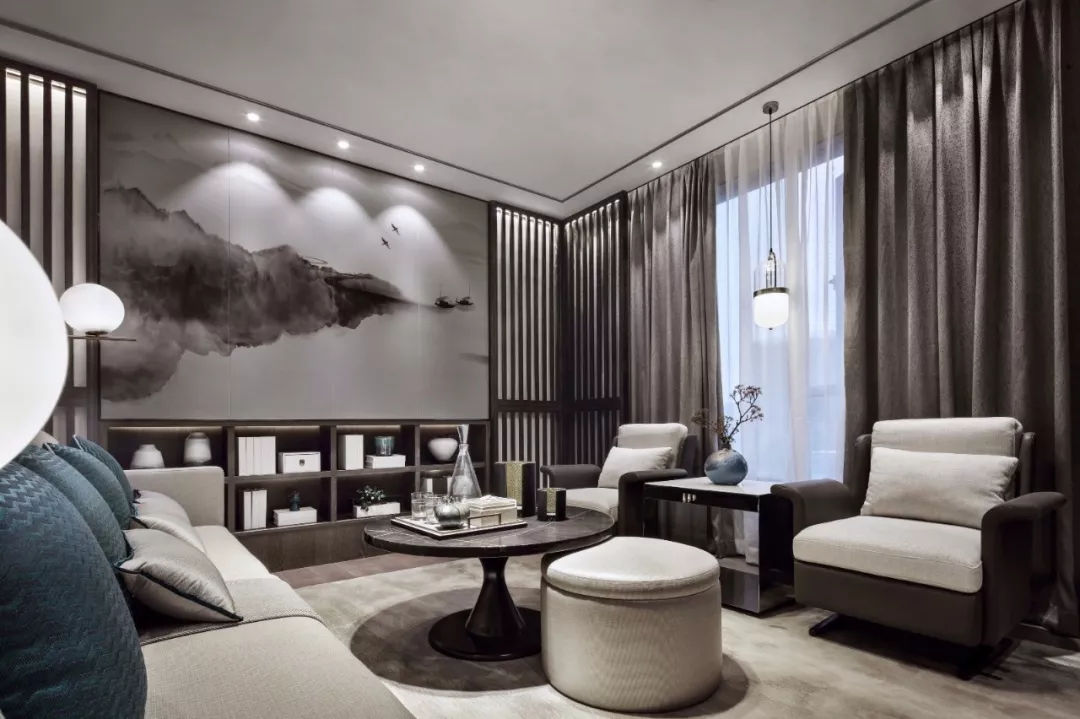 當“黑白灰”和“新中式”相遇,造就了一幅幅灰色的水墨寫意行云流水,一氣呵成。這樣躺在舒服的沙發(fā)上,光是欣賞著仿佛有生命般的水墨背景,任千年的故事順指間流淌,已經(jīng)是一種享受。
