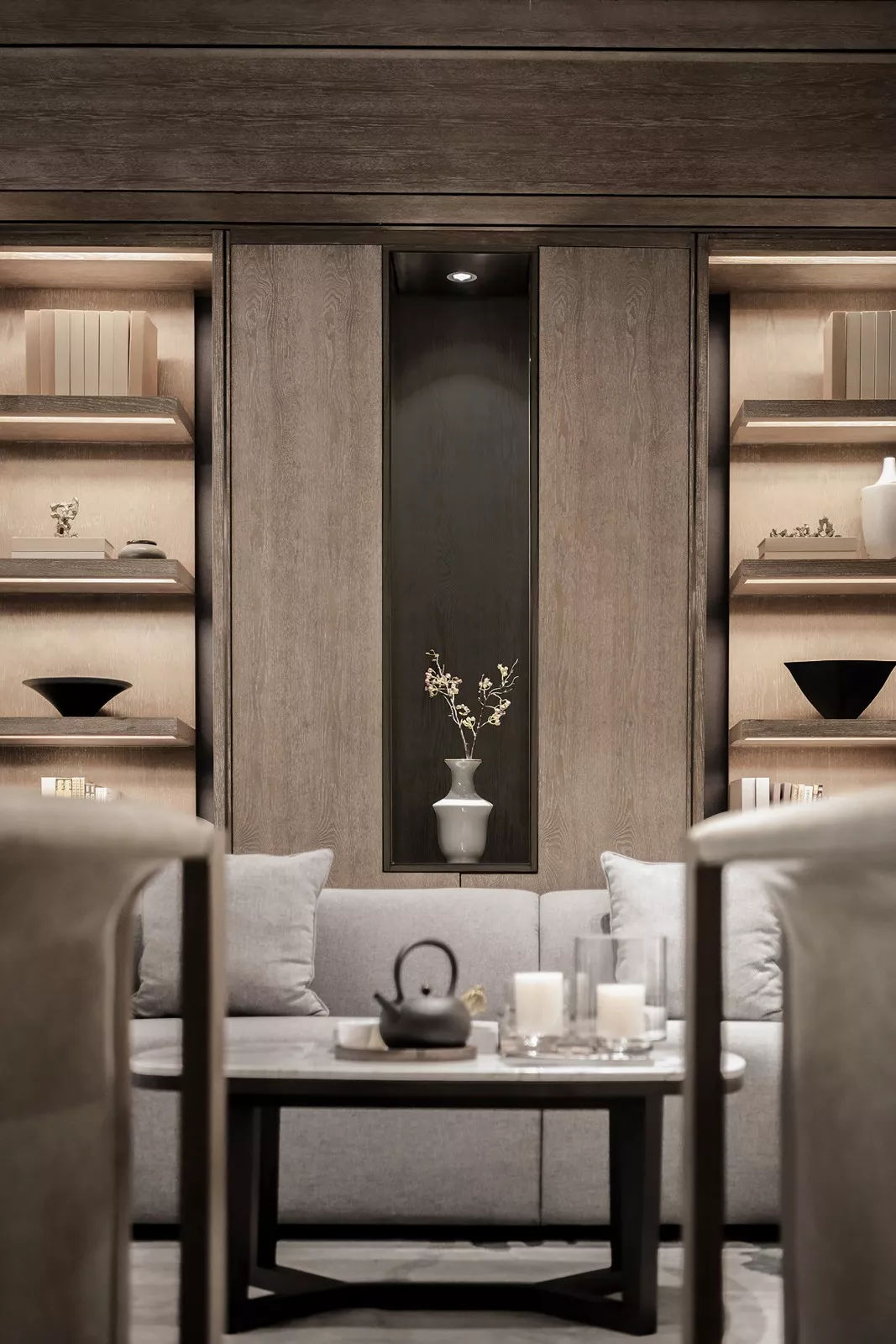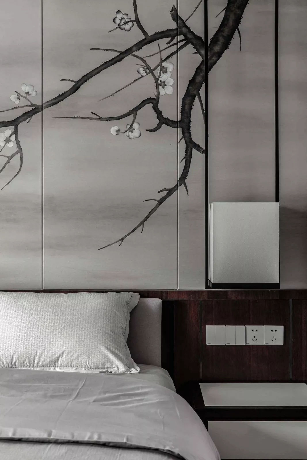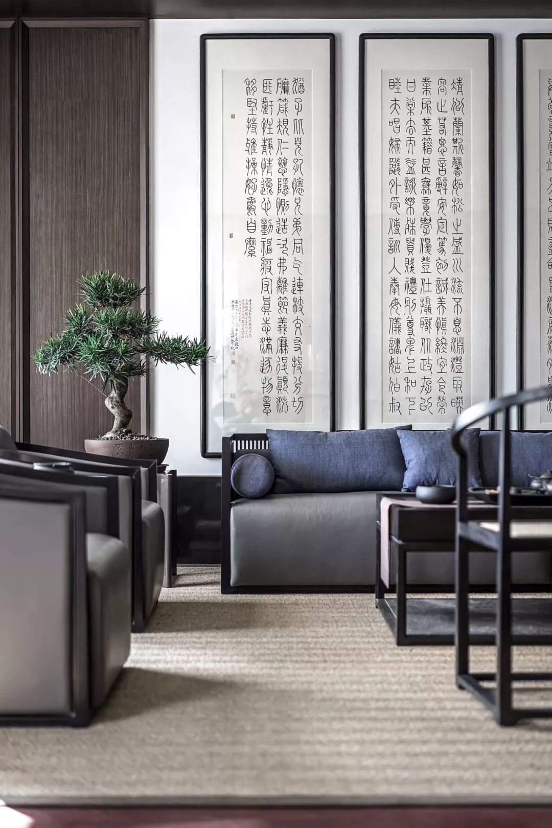 當“黑白灰”和“新中式”相遇,造就了一幅幅灰色的水墨寫意行云流水,一氣呵成。這樣躺在舒服的沙發(fā)上,光是欣賞著仿佛有生命般的水墨背景,任千年的故事順指間流淌,已經(jīng)是一種享受。