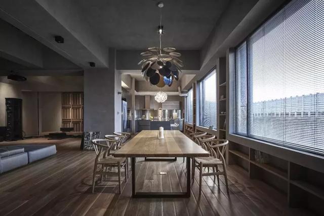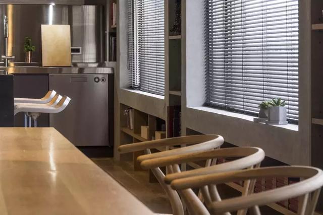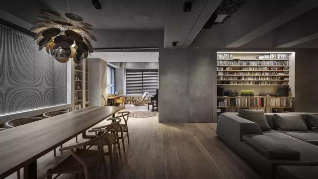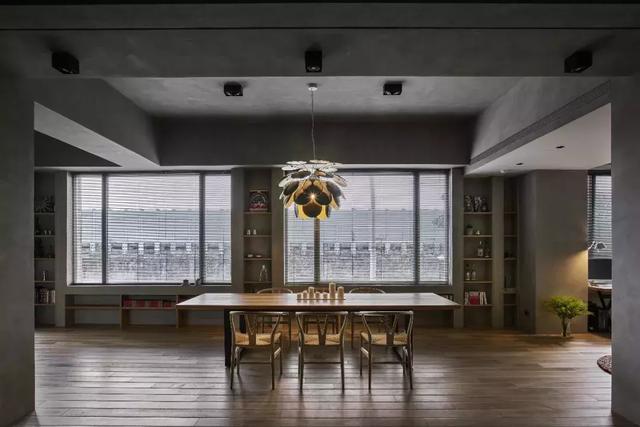 設計概念是把堤防想像為室內(nèi)空間的外墻,透過空蕩的快速道路和南向鄰窗側留白的開放空間,創(chuàng)造出景深的層次;廚房中島餐桌書房一字排開,梁柱結構外露,天花裸露,強調(diào)商辦大樓挑高優(yōu)勢;色調(diào)延續(xù)堤防的灰色斑駁色調(diào),質(zhì)感呼應堤防粗獷感;由外而內(nèi)是灰階延續(xù)。