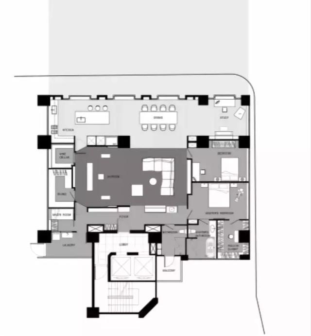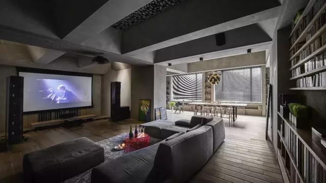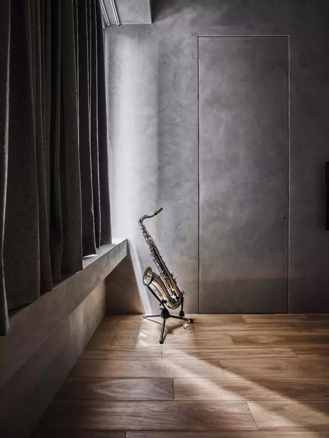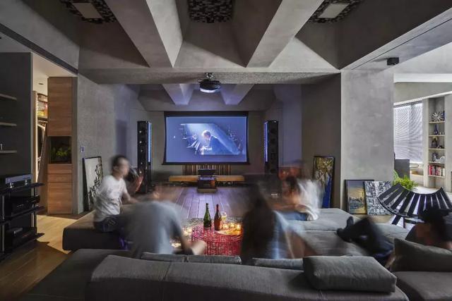 客廳/音響室是全室空間中心,南向開口鄰窗側留白的開放空間,此區(qū)天花和壁面為音場反射效果而設計的不同立體造型擴散板;其余方向都被私密空間-主臥次臥及服務空間-入口玄關衣帽間潛水設備室酒窖環(huán)繞著,灰階延續(xù)著。