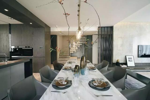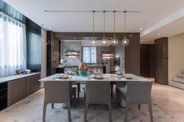 “延續(xù)”性的設(shè)計脈絡(luò),還體現(xiàn)在樓梯與餐廳的吊燈,相得益彰的出現(xiàn),使餐廳成為橫向與縱向兩條空間動線的中心,更加精致完整。西餐吧臺在明暢的中庭內(nèi)形成餐廳與廚房視野交疊的可能,令人與人之間不經(jīng)意的發(fā)生互動。