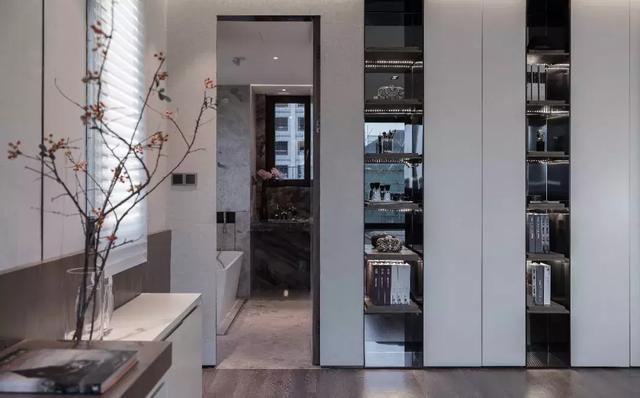 就好像主臥,為了延展“居其室”的可能,張健帶入了空間功能跨界的設(shè)計理念—即酒店商業(yè)型空間與居家空間的混搭。衣柜為整面漆板的柜門,結(jié)合開敞的層板架,帶來虛實對比反差,從外觀和實際功能賦予居住者全新的感受,仿佛置身于高端酒店,但也不失家的溫暖。