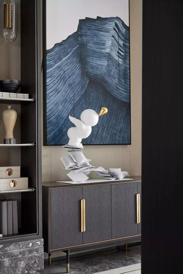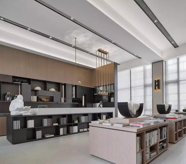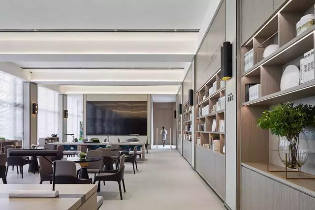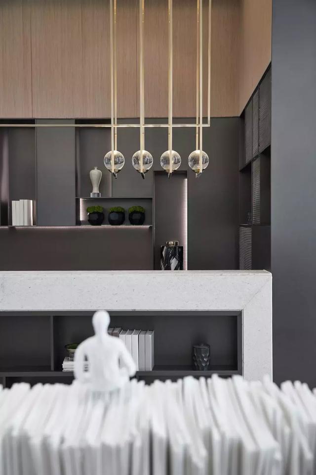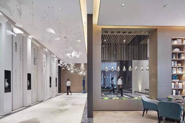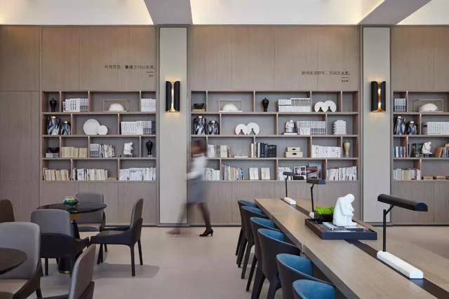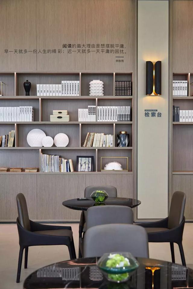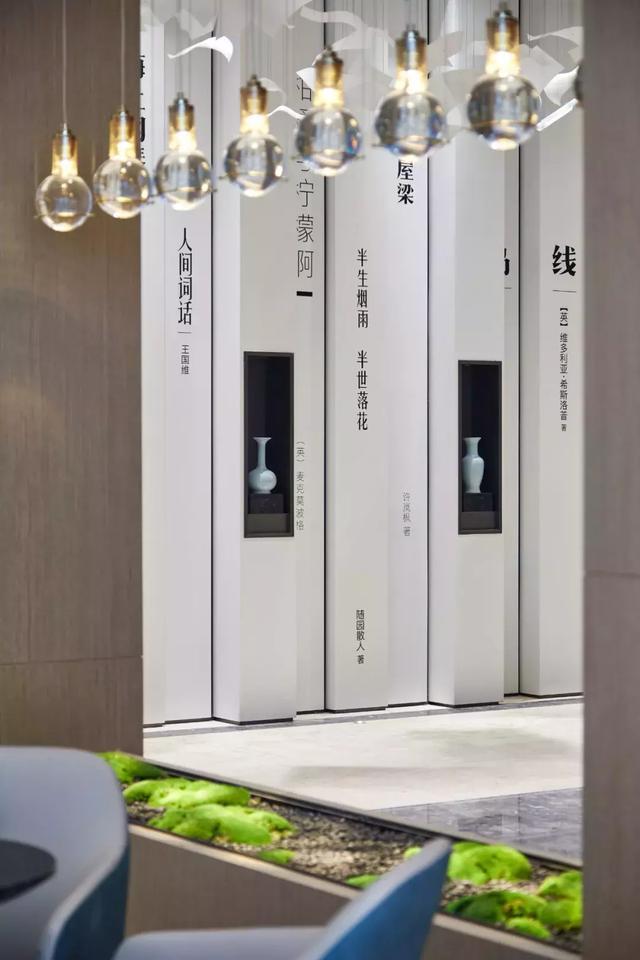 設(shè)計(jì)師通過對空間設(shè)計(jì)的升級,為這個(gè)售樓處打造了一個(gè)具有辨識(shí)度的藝術(shù)長廊,高三米八的書墻,以夸張的表現(xiàn)手法,營造出素雅靜逸的書苑氛圍。于書墻中嵌入裝飾柜,放置的白瓷花瓶,卻有“書中自有顏如玉”的既視感。