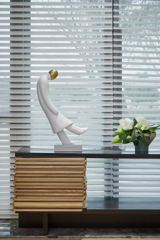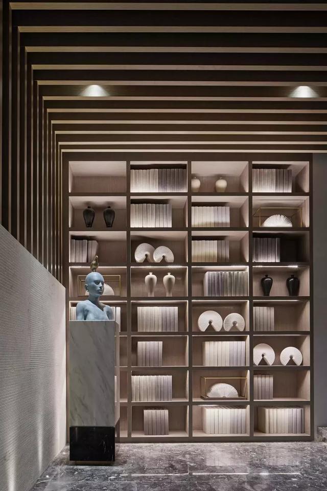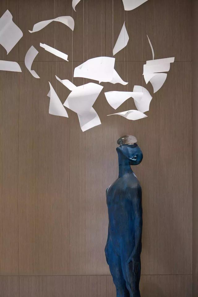 沿著樓梯,層層疊巒的書簽“鑲嵌”在木格柵上,順序而上,與藝術(shù)長廊的書墻呼應(yīng)得當(dāng),強(qiáng)化了整個(gè)空間的意境。閉目的雕像似乎在傾聽內(nèi)心的聲音,再華麗的粉飾都無法將這一純粹的空間“情境”營造出來——平靜,和諧與秩序。