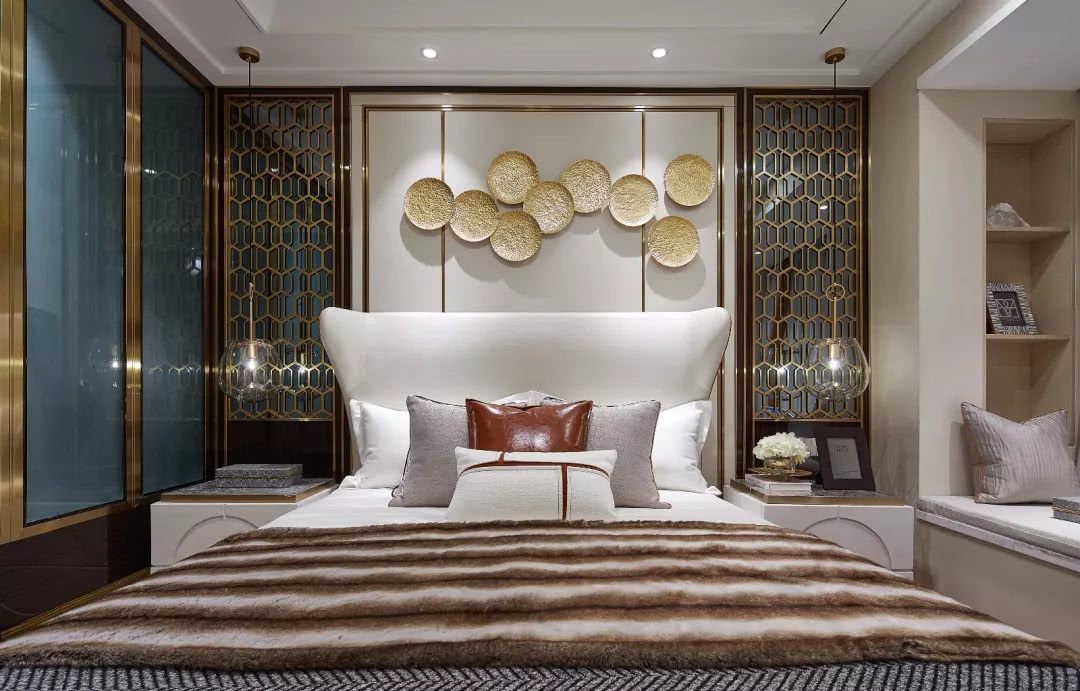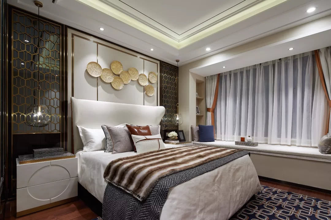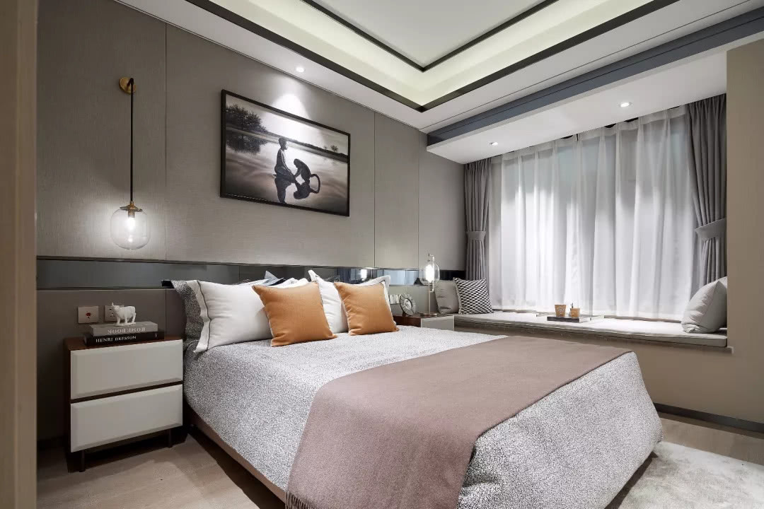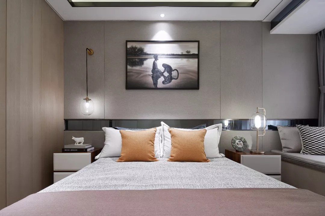 主臥以一個精致、雅奢、從容的生活方式為空間主題,提取自然及生活中的新東方美學(xué)元素,構(gòu)筑出藝術(shù)氤氳的舒適空間。