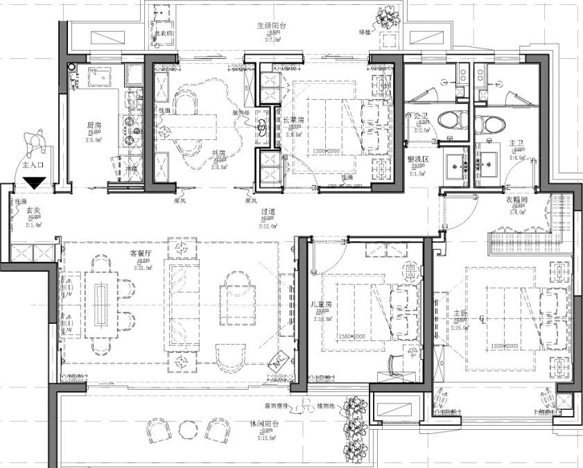 布局上將穩(wěn)定活動區(qū)——客廳及用餐區(qū)呈開放式設(shè)計(jì),劃分在室內(nèi)的陽光充足處,毗鄰休閑陽臺,空間上給人以通透之感。