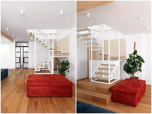 ▲通往二層的臺(tái)階利用木與金屬元素搭配,帶來輕盈靈動(dòng)的視覺感受,鮮紅色的模塊沙發(fā)與餐廳呼應(yīng),卻與周圍形成鮮明對比。