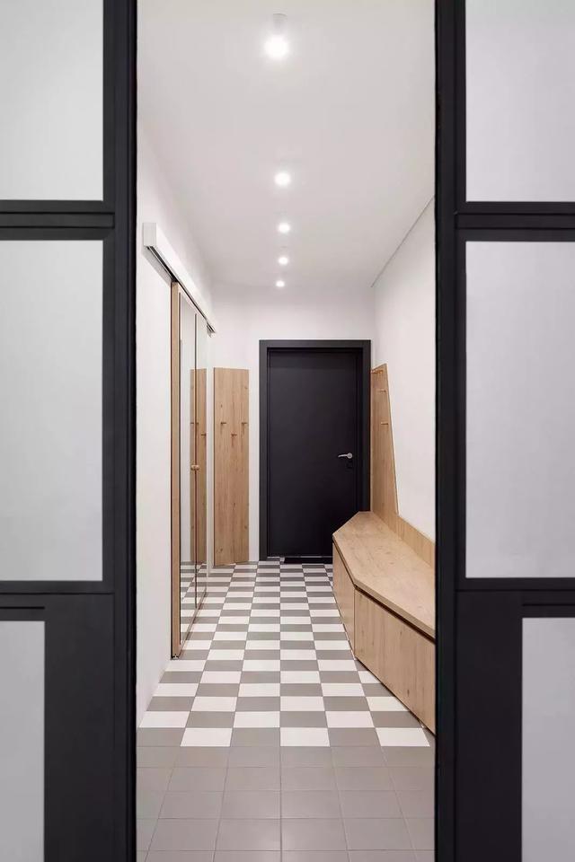 ▲同一側(cè)墻面共有兩處黑框移門,一處通向入口,另一處則是廚房。