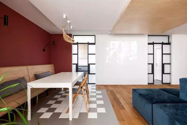 ▲餐廳被設(shè)置在原先的隔間里,拆除隔墻后僅保留部分立柱作為功能區(qū)的劃分,地面的延續(xù)了入口處的元素,搭配木料,營造出溫馨與舒緩,卻又大膽將餐廳背景涂刷至紅色,帶來強(qiáng)烈的視覺感受。
