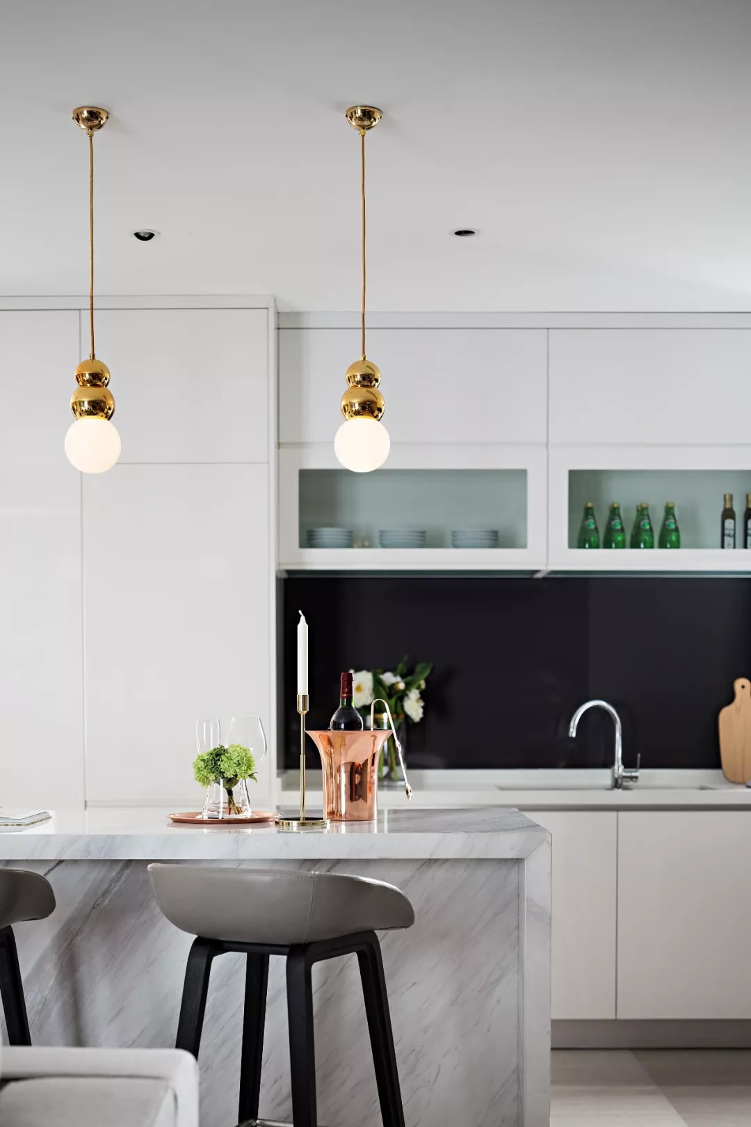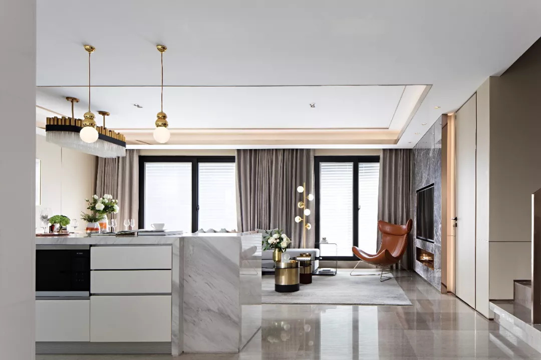 廚房、客餐廳互聯(lián)開敞,以三折階梯式對應(yīng)劃分功能區(qū),塑造虛實格局。客廳一側(cè)以純白懸浮柜體內(nèi)嵌黑色置物架,構(gòu)成別樣一景;另一側(cè)利用金屬黑鈦分割的木飾面電視背景墻,搭配石材穿插手法打造而成的底座,立體感十足。