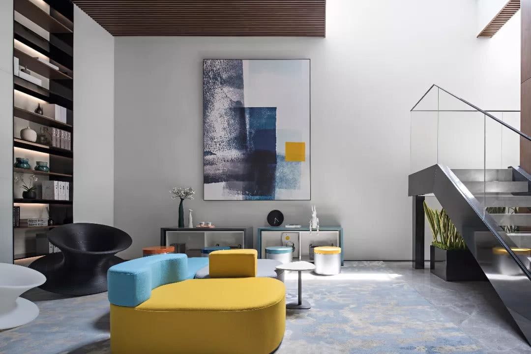 親子主題的地下層,木飾面與米色壁布,營造出休閑氛圍。歡快的藍黃亮色家私裝點,寥寥幾筆便構(gòu)成了一個曼妙的兒童嬉戲之境。