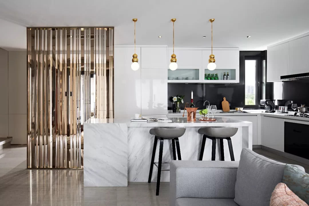 入口玄關(guān)處安放可移動金屬格柵,隔而不斷,又在一定程度上確保私密性。室內(nèi)通過開放交融式設(shè)計,讓廚房、島臺與客餐廳連通,提升空間開闊度,也是對現(xiàn)代生活方式的回歸與重塑。