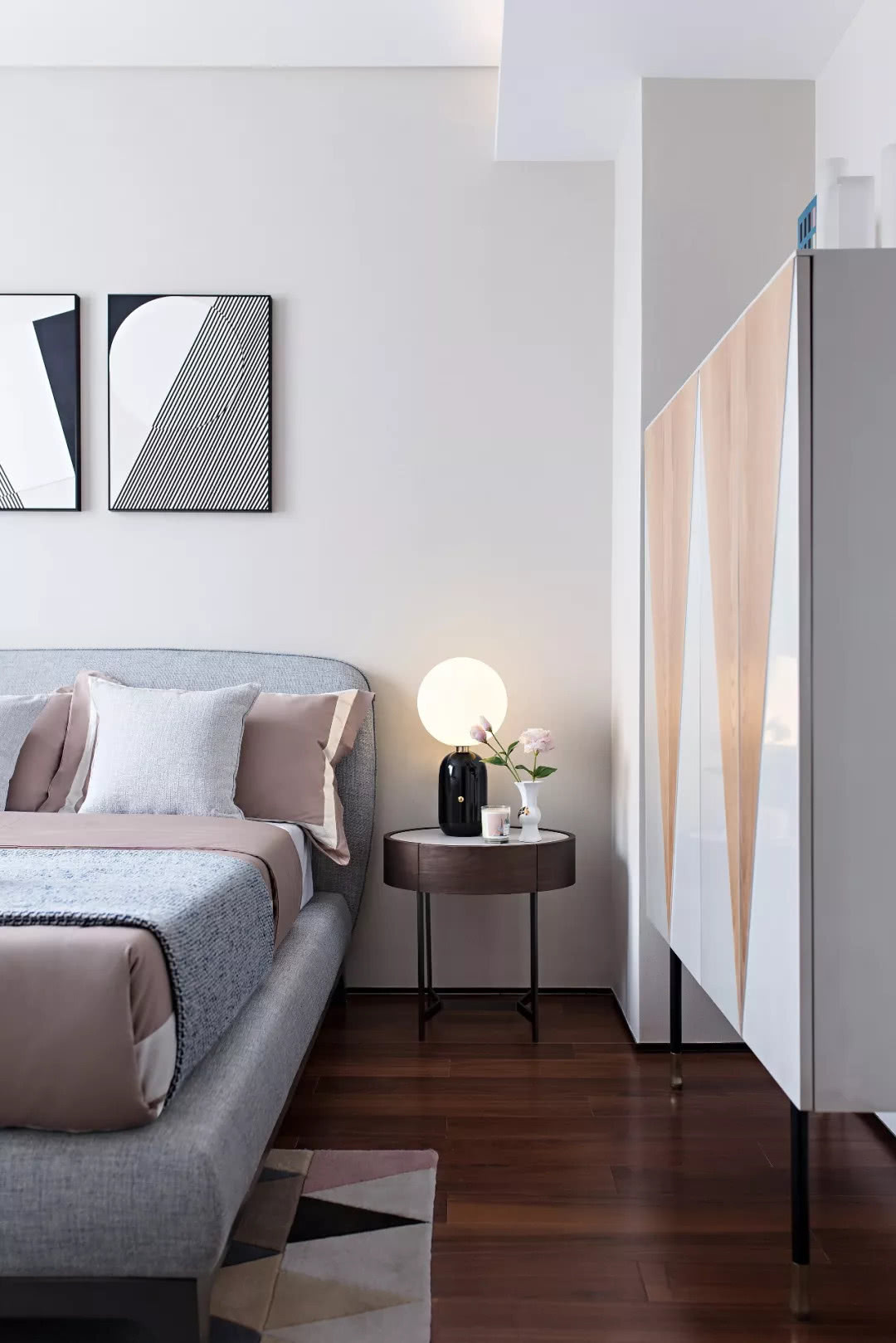 次臥黑白撞色的壁畫,柔和清雅的地毯和儲物柜,怡然自在的體驗撲面而來。