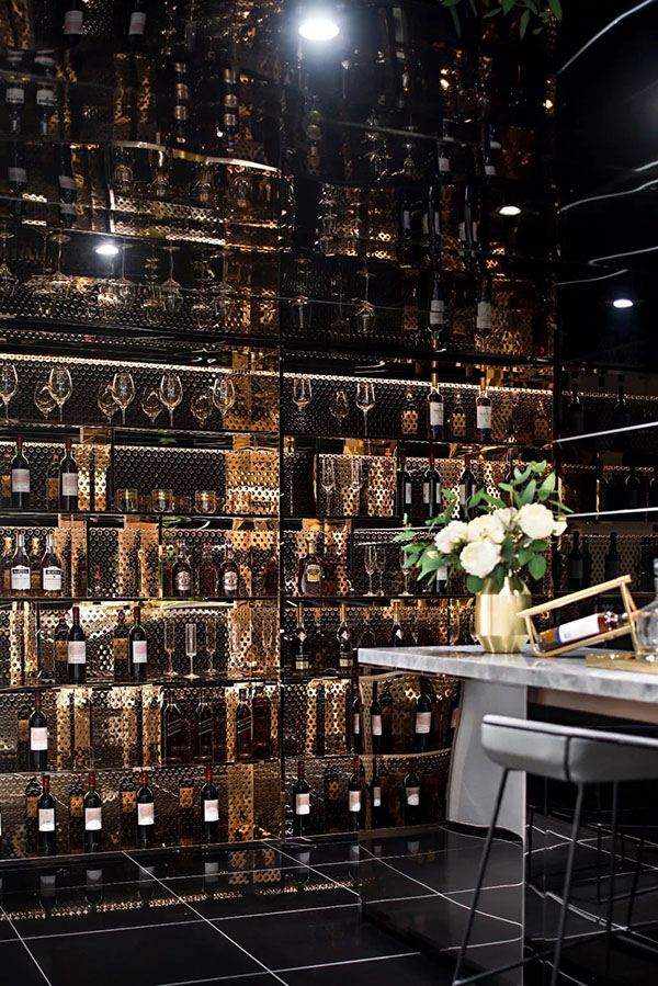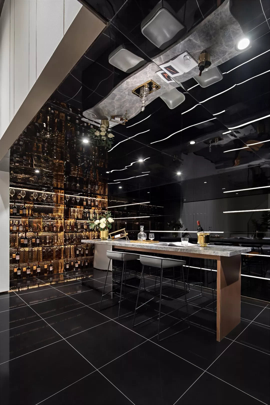 轉(zhuǎn)至地下室,有效整合高挑空形式,借助夾層分隔設(shè)置,實現(xiàn)地下雙層空間,打造洽談區(qū)、品酒區(qū)、影音室等活動空間,滿足多樣功能區(qū)的需求。由樓梯入口遞進而入,多種不同元素又構(gòu)成震撼反差。鏡面不銹鋼、金屬沖孔板與石材混搭,再融入不同的光韻,交相映射出層巒疊嶂的魔幻色彩,極其動感酷炫。