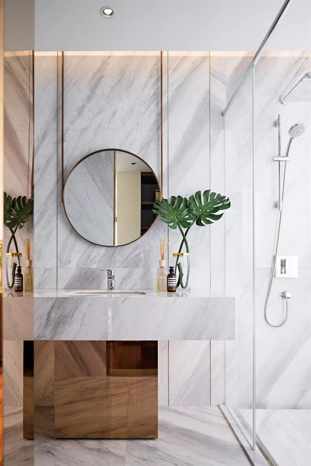 主衛(wèi)臺盆造型運用形體穿插手法,定制的懸掛鏡體凸顯輕盈之態(tài),方與圓的幾何線條勾勒出空間平靜柔和的一面。