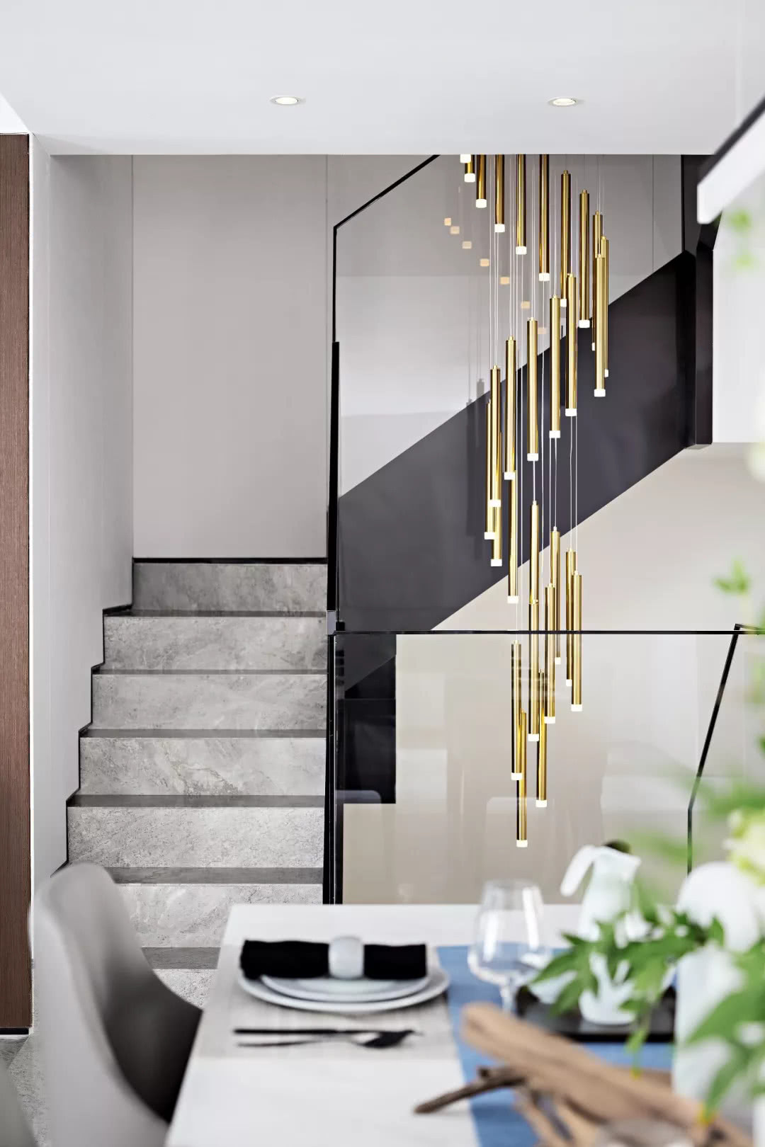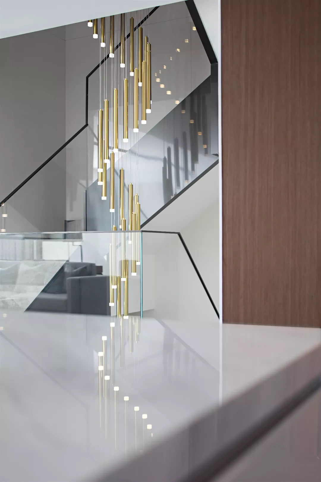 樓梯扶手處的整塊透明玻璃,采用1cm金屬不銹鋼包邊,展現(xiàn)其精致的細節(jié)和獨特的工藝。同時搭配旋轉(zhuǎn)狀吊燈,進一步提升這一隅的飄逸感。