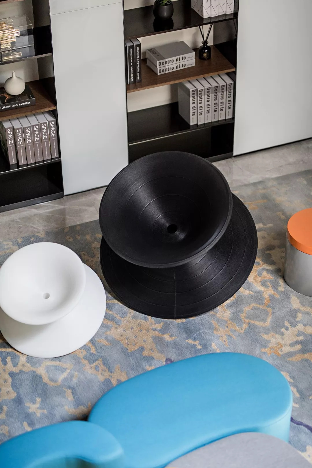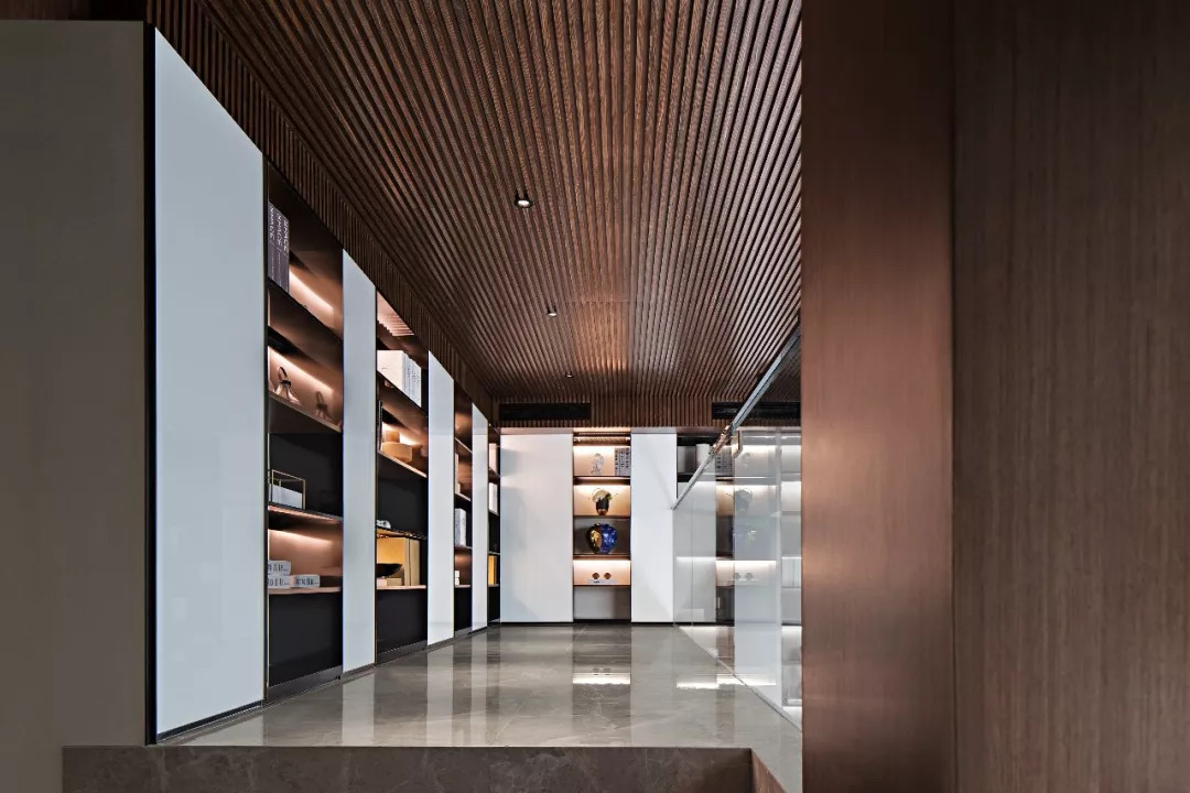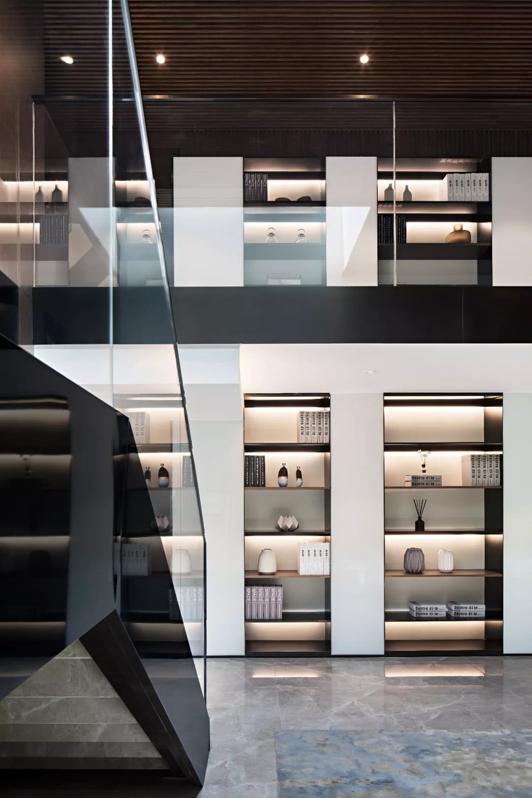 探入夾層,是一處類似圖書館的場景設(shè)計。每件物品似是穿墻而出,書架層板內(nèi)光影變化和頂部格柵的序列感給人強烈的視覺沖擊。大膽創(chuàng)意的巧思由最下層延續(xù)至此,上下兩部分以黑色塊區(qū)隔,同時在顏色和塊面形式上承接呼應(yīng)。
