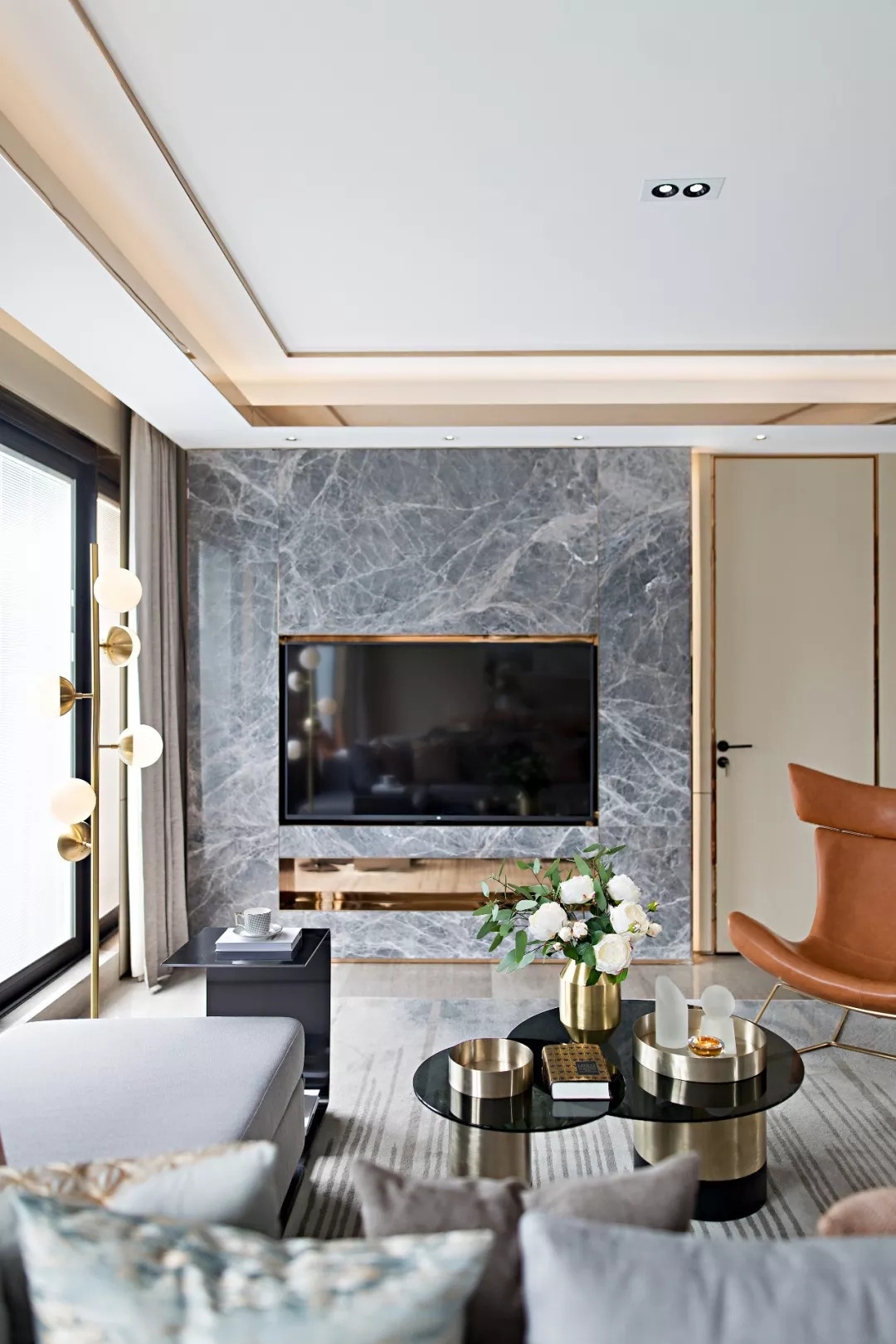 在柔和燈光的映襯下,地毯紋路創(chuàng)造視覺延伸性,橘色餐椅喚醒用餐環(huán)境,勾勒出浪漫空間氛圍。電視背景墻采用深色系意大利灰大理石,有力塑造沉穩(wěn)大氣的風(fēng)范。