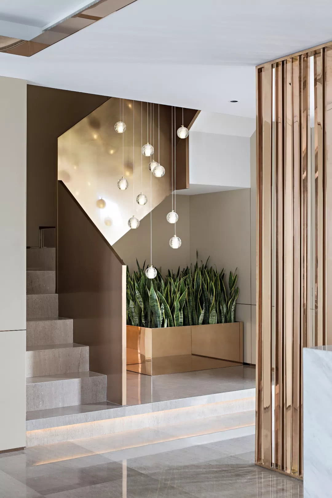精致的細節(jié)雕刻出樓梯間硬朗的建筑形態(tài),組合吊燈隨性散落,盡顯柔情與細膩。陽光灑入,綠植綻放生機,一切都是如此的舒暢與愜意。